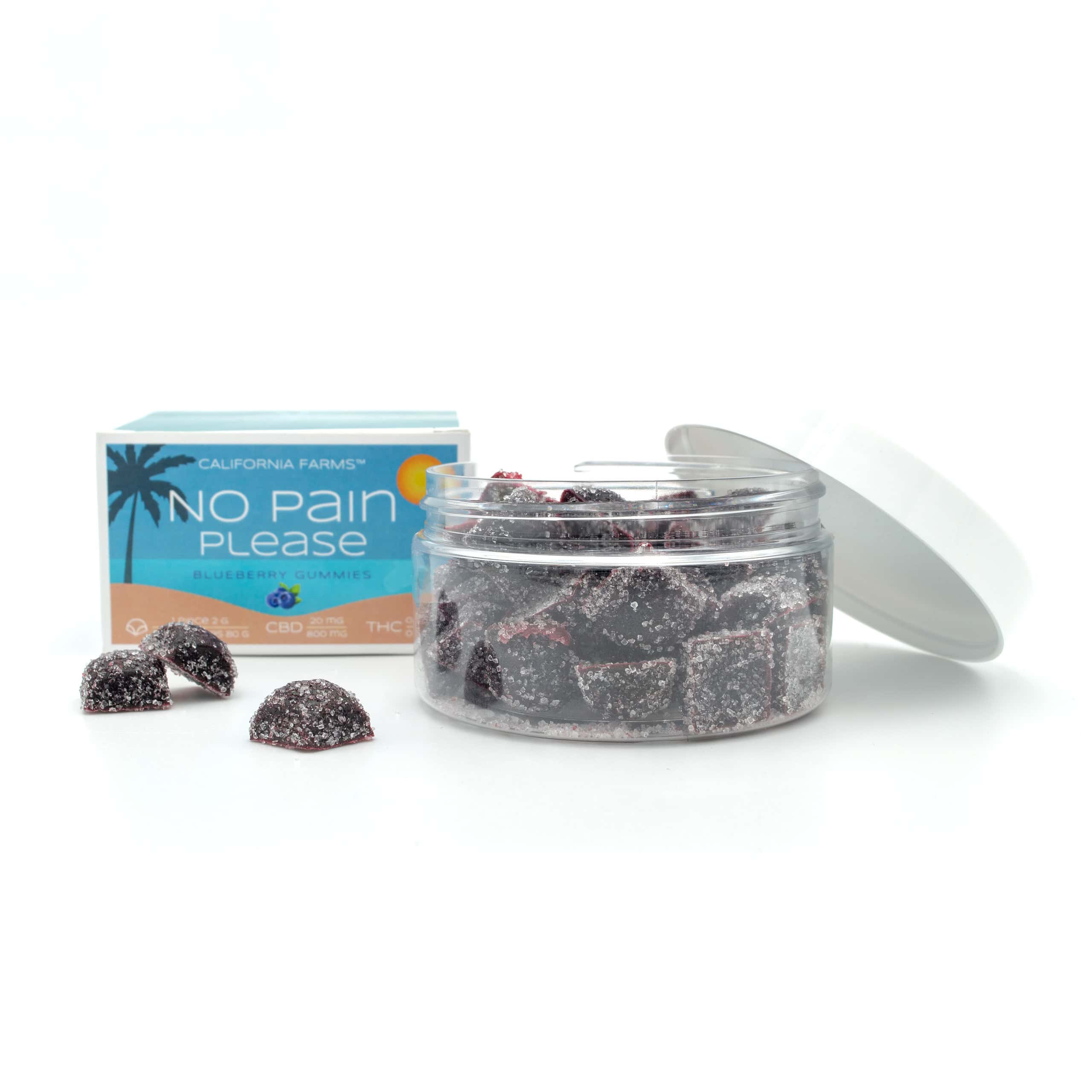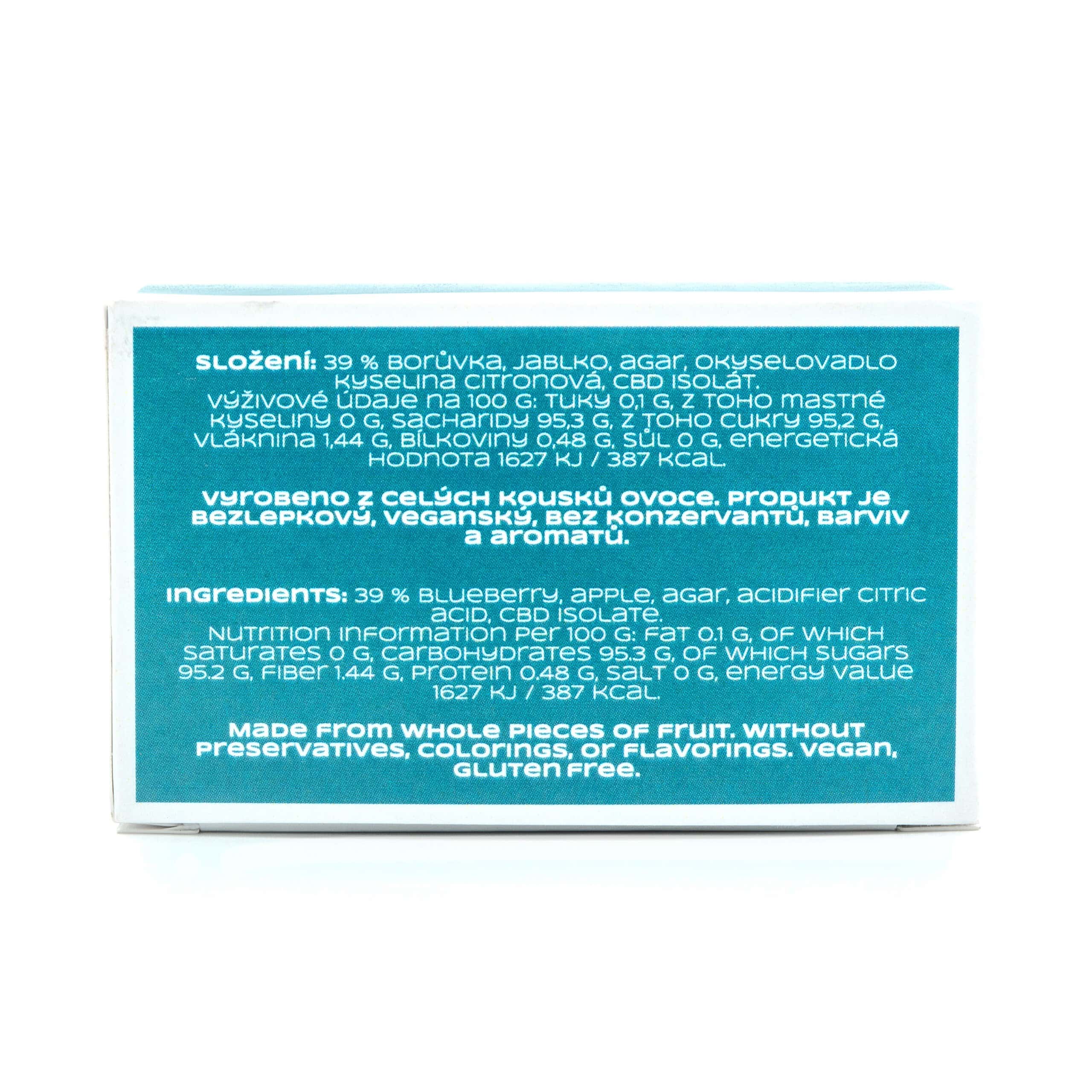 Ingredients: 39% blueberry, apple, agar, acidifier, citric acid, CBD isolate.